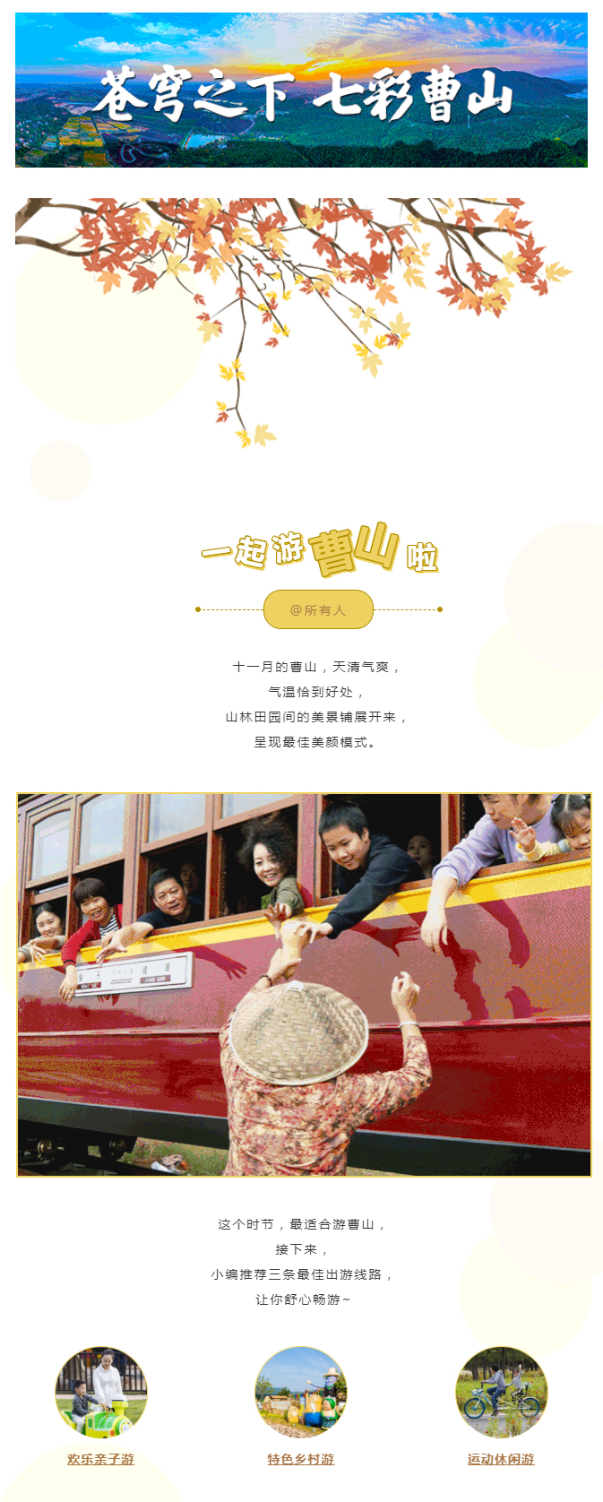 七彩曹山欢迎您来体验深山古刹、古道竹海、曹山花海、十里梅岭、桂花天地等美景,采摘、垂钓、骑行、露营、农家乐......